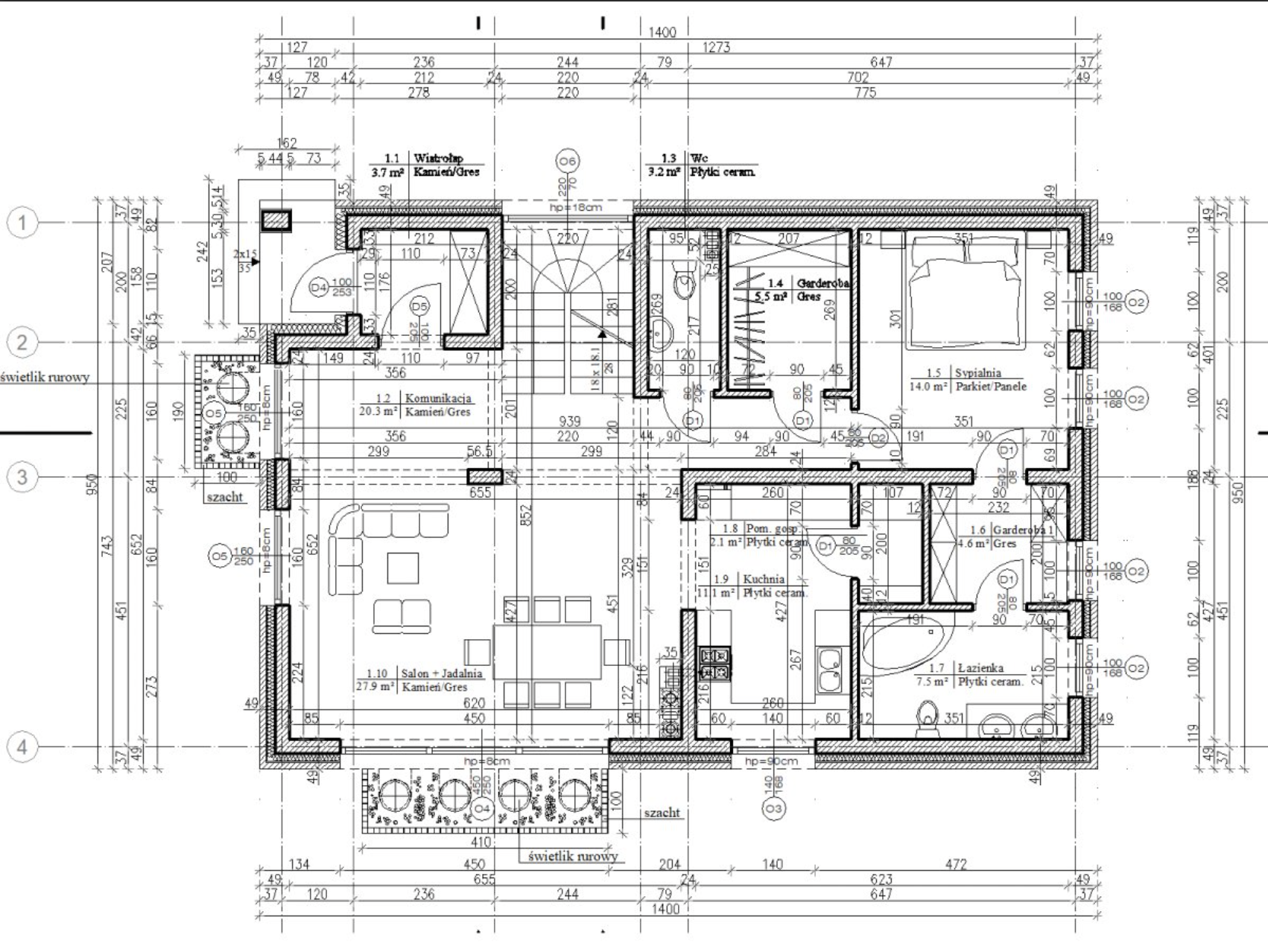 Ściany nośne wykonane z pustaków H+H o grubości 25 cm.